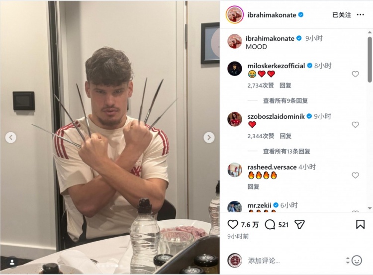 利物浦中卫科纳特赛后更新社媒动态,晒出多张照片,其中包括队友凯尔凯兹模仿金刚狼的照片,凯尔凯兹则以笑哭的表情回应。